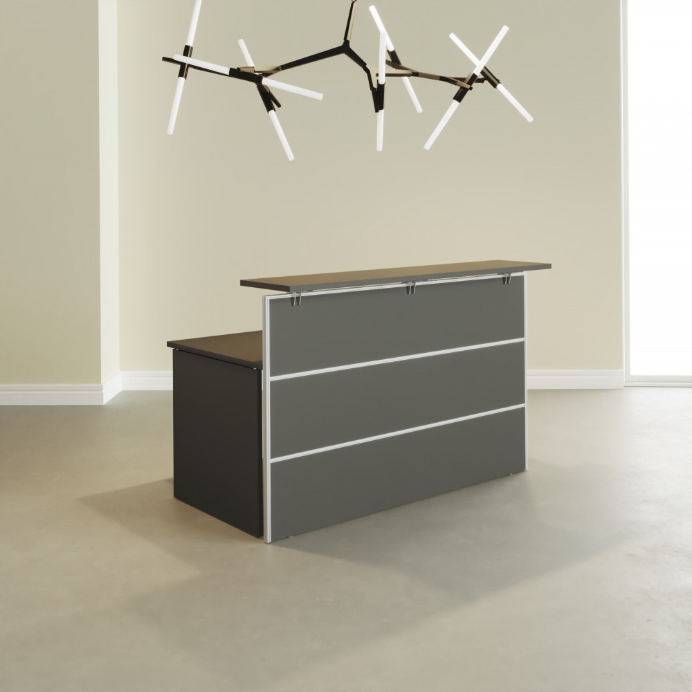 - A união entre o tampo do balcão e a estrutura do balcão é realizada por meio de um grampo metálico e com acabamento com pintura epóxi PRATA RAL-9006
