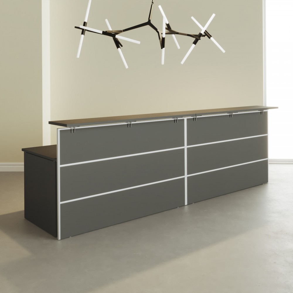 - A união entre o tampo do balcão e a estrutura do balcão é realizada por meio de um grampo metálico e com acabamento com pintura epóxi PRATA RAL-9006