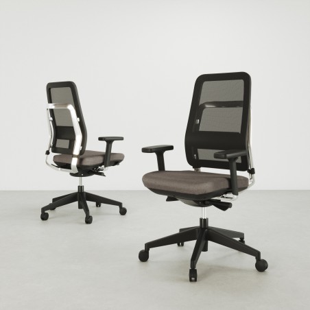 - Encosto de rede preta em poliéster com um pré-aro em polipropileno y 12% em fibra de vidro. A estrutura visível da contra estrutura é feita de polipropileno e 25% de fibra de vidro, acabamento preto texturado.